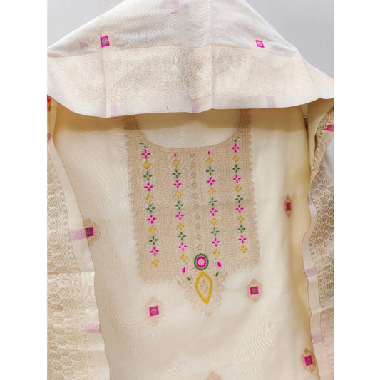 Women's Banarasi Silk Printed Unstitched Salwar Suit Material With Dupatta (White, 3Mtrs)