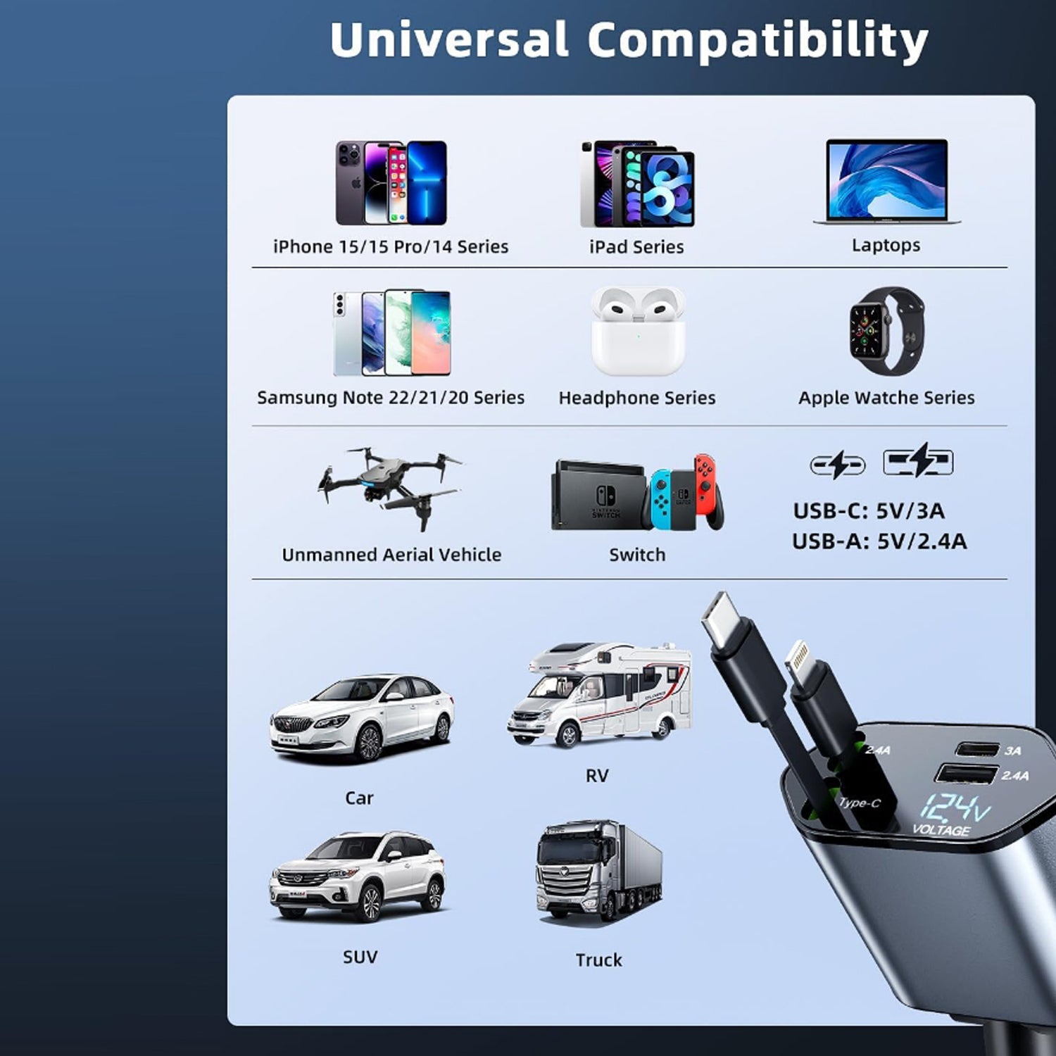 4-in-1 Super Fast Car Charger With Dual Built-in Cables Dual Usb Ports