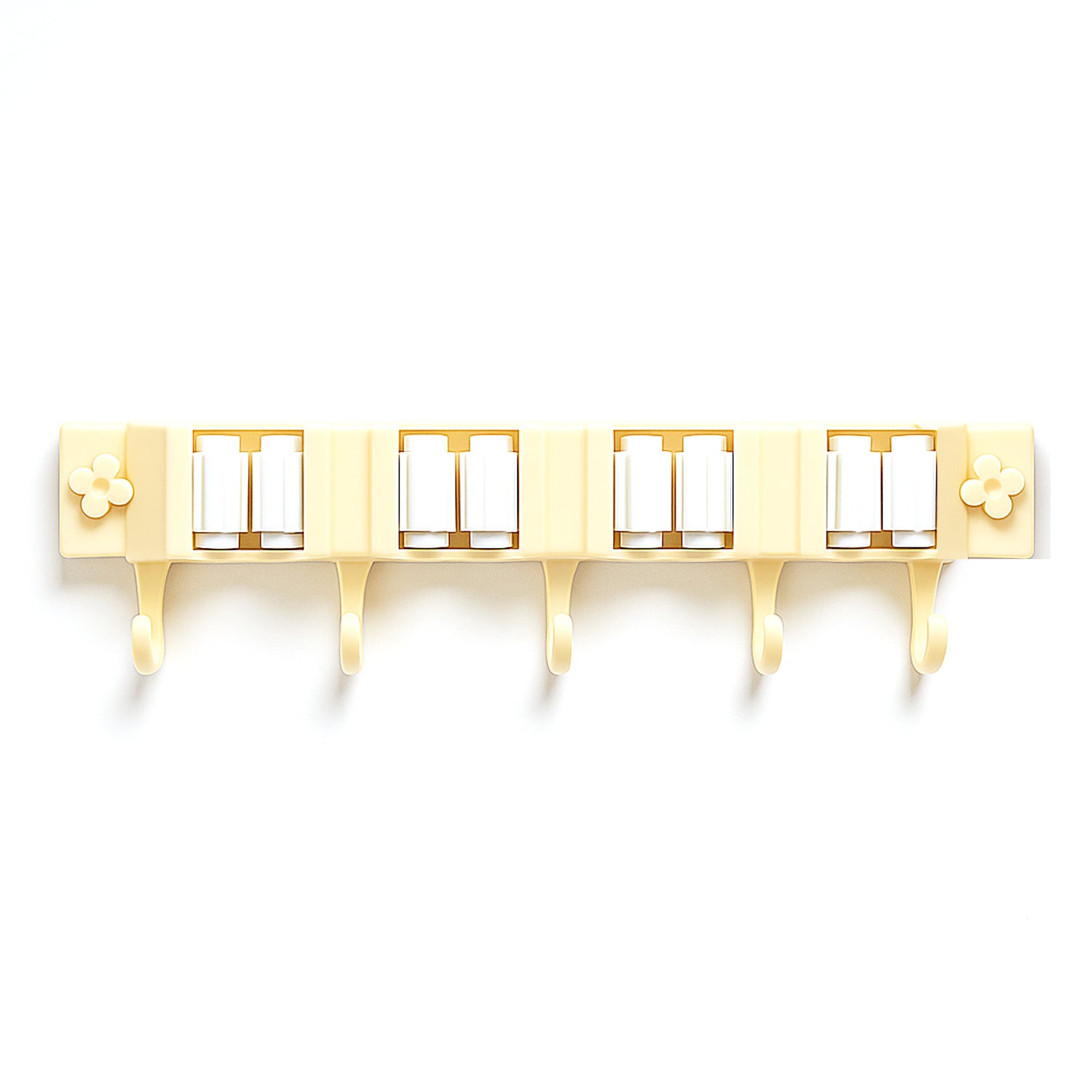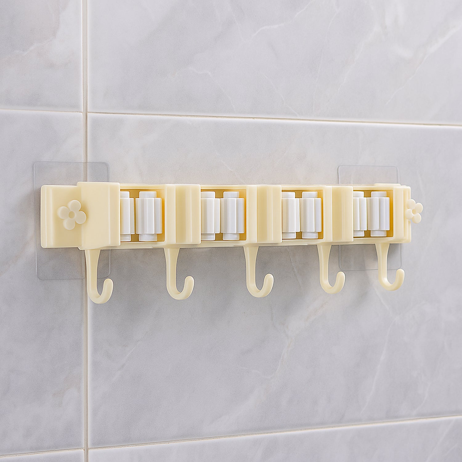 Keep floors clear and tools neatly in place with this sturdy wall-mount organizer. The rack uses high-friction roller grips to hold broom and mop handles securely, while integrated utility hooks keep dustpans, brushes, towels, and other accessories within easy reach. A wide self-adhesive backing lets you mount it on smooth tile or painted walls without drilling, helping you maximize vertical space and reduce clutter. The smooth, wipe-clean construction resists moisture and everyday wear, making it ideal for bathrooms, kitchens, balconies, and utility areas. Designed for quick installation and daily reliability, it turns an unused wall into a tidy, accessible storage zone.